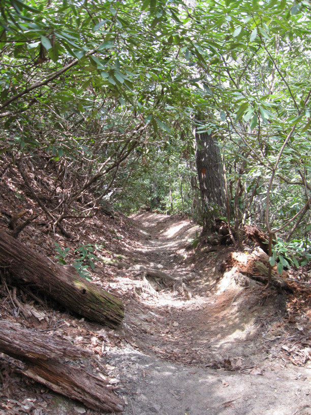 The falls are in two sections totaling about 50 feet that slide down the bedrock rather than fall vertically into a large plunge basin. There is a very steep path heading down to the basin but the foot of this cliff is smooth rock. There is a rope tied there to aid in descending to the basin but I found the rock too slippery and was unable to get a proper foothold. I took the picture below from the top of this rock where the rope is tied off.