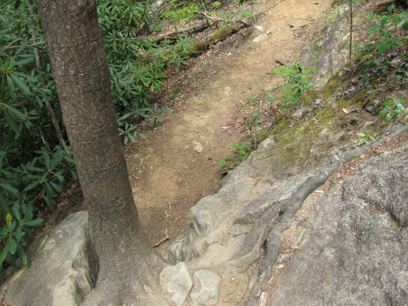 There are several areas where the trail has been washed away and require careful crossing, finding an alternate path to take or a bit of rock climbing. The third photo is looking down at the trail and the fourth photo is looking back up after climbing down. It is about a six foot drop.
